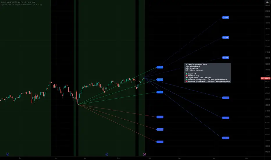 Free Lite edition of a Gann-inspired structure framework.Plots pivot-based Gann fan angles to visualize potential support/resistance “rails,” and highlights momentum regimes when price rides key angles (2x1 / 3x1).