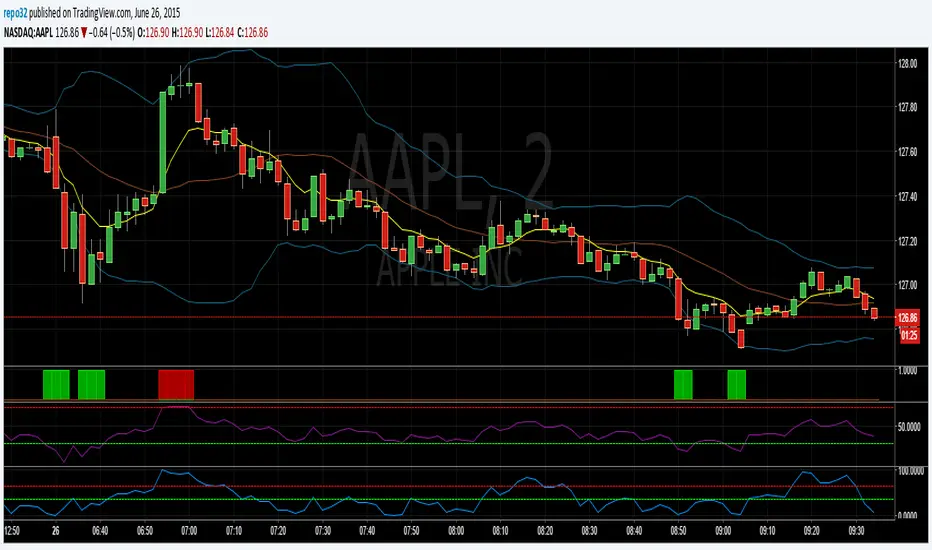 This script will give you red or green columns as an indication for oversold/overbought based upon the rsi and stochastic both being at extreme levels (you set). The default oversold is at 35. If Stochastic and RSI fall below 35, you will get a green column (Both indicators at the extreme). Play with your levels to see how your stock reacts. RSI and Stochastic can both be changed along with each of the levels you would like the color change. I have set mine at RSI low: 37, RSI high: 63, Stoch low: 10, and Stoch high: 90. These levels have been working well for me on AAPL. Enjoy and don't forget to leave a comment if it helps your trading or you have other ideas about what is working for you.