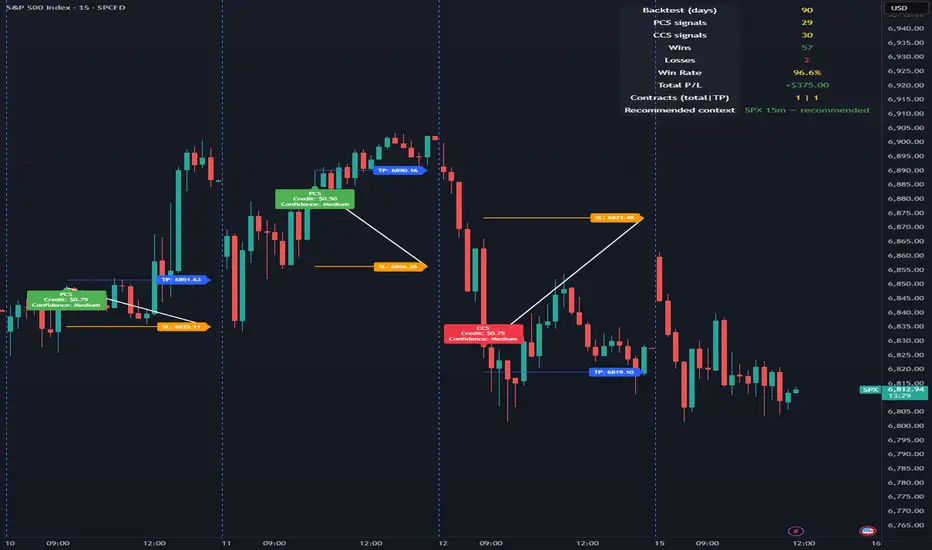 This indicator is designed to assist 0DTE credit spread traders by providing rule-based PCS (Put Credit Spread) and CCS (Call Credit Spread) signals, dynamic risk levels, and an integrated performance summary — all within a single, cohesive tool.