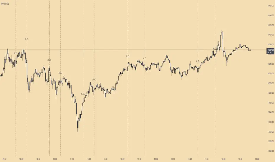 This script allows traders to visualize the range of time when a macro (an automated series of instructions/trades from large fund traders, executed by an algorithm) will likely occur in the market. It does this by drawing vertical lines and labels on the chart at these specific times: