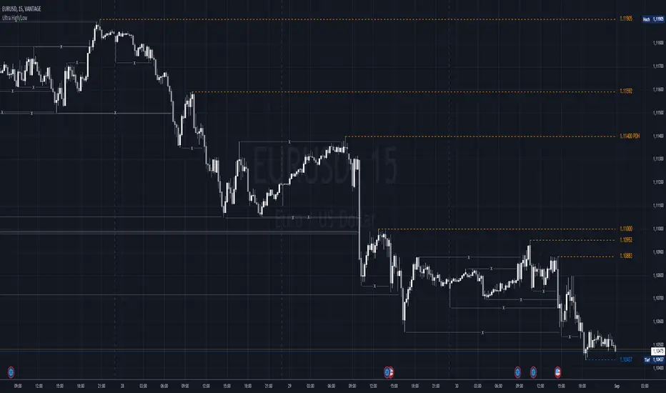 The Ultra High/Low script identifies and marks significant highs and lows on a trading chart. These are specific points where the price reached a peak or bottomed out before reversing. The script draws lines at these levels, which can be extended, and it also labels the exact price at these points. This makes it easy for traders to see where the price has changed direction previously, helping them make more informed trading decisions.