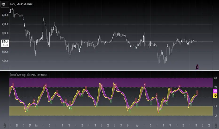 OVERVIEWThe [blackcat] L2 Veronique Valcu VWAP Z-Score Indicator is designed to help traders make informed decisions based on volume-weighted average price (VWAP) and standard deviation. This indicator calculates two smoothed Z-score curves using customizable parameters, providing visual cues for potential trading opportunities. The script plots these curves and fills the area between them, highlighting zones where buying or selling might be advantageous. Additionally, it includes horizontal reference lines at specific Z-score levels and generates alerts for buy/sell signals.