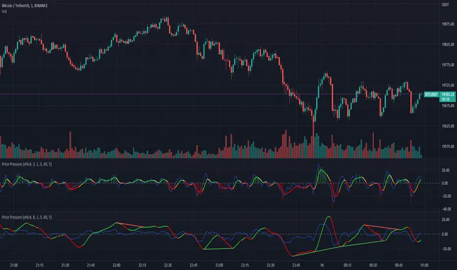 The Price Pressure indicator shows directional price movement similar to how MACD works but rather than showing the difference between 2 moving averages of different lengths it shows the changing behaviour of different types of moving averages of the same length.