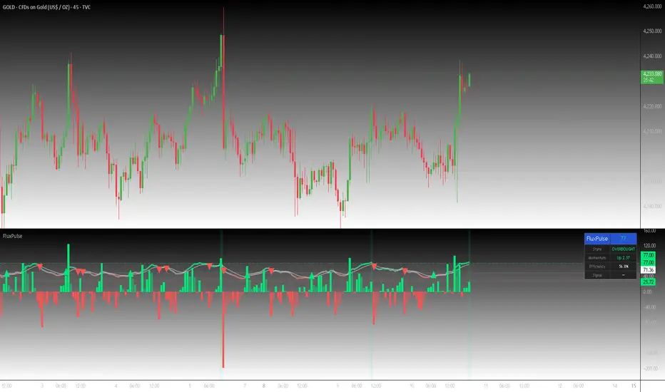 FluxPulse Momentum is a composite oscillator that blends three distinct momentum components into a single, smoothed signal line. Rather than relying on a single indicator, it synthesizes adaptive RSI, normalized rate of change, and a Kaufman-style efficiency ratio to provide a multi-dimensional view of momentum.