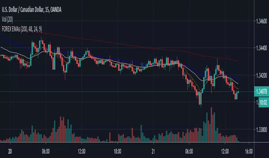 Pretty simple here - this is the base EMAs I suggest most traders use in the FOREX market for swings and scalp trading. Works well on 5m, 15m, 1H, 4H, and daily trading if you design an edge to interpret the relationship these averages of price are telling you.