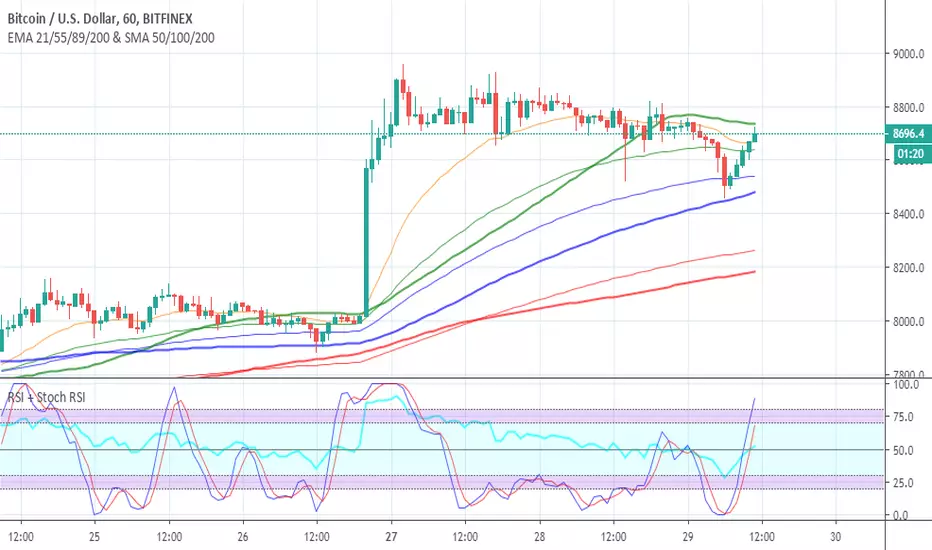 Free to use indicator combining all important time periods for two of the most valuable trading tools: EMAs and SMAs. As you can see on the chart and previous time periods, BTC often bounces off these, giving you an insight into possible future price movement. Add to your favourite scripts now at the bottom of this page and stay ahead of the game.