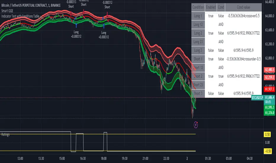 Overview: The "Indicator Test with Conditions Table" is a customizable trading strategy developed using Pine Script™ for the TradingView platform. It allows users to define complex entry conditions for both long and short positions based on various technical indicators and price levels.