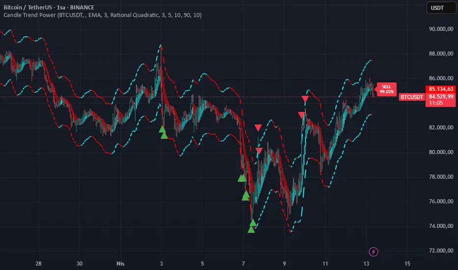The Candle Trend Power is a custom technical indicator designed for advanced trend analysis and entry signal generation. It combines multiple smoothing methods, candle transformations, and volatility bands to visually and analytically enhance your trading decisions.