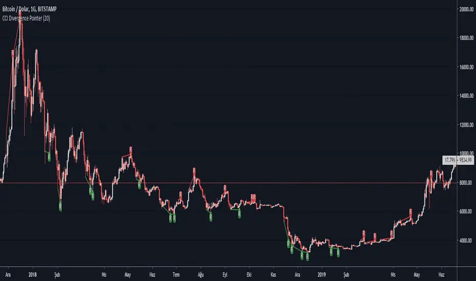 This script points regular and optionally hidden types of bullish and bearish CCI divergences on the chart by drawing the divergence lines and optionally labels.