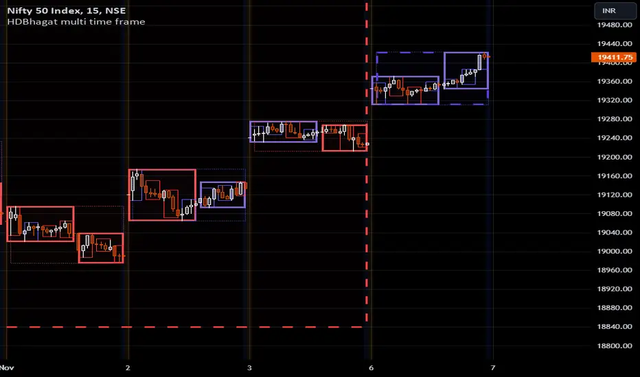 Box Visualization: The indicator represents price movements within each timeframe as colored boxes. Green boxes indicate bullish price action, while red boxes represent bearish movements.
