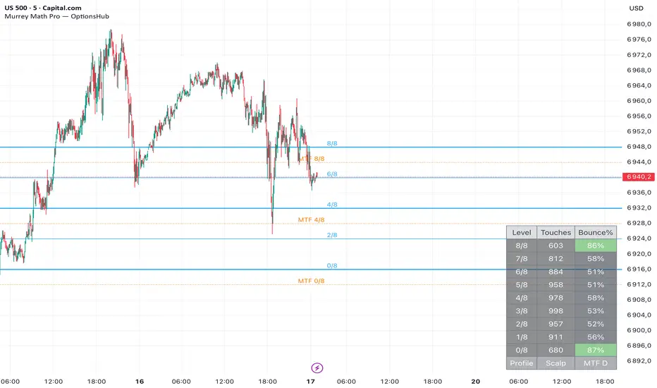 Murrey Math Lines are a grid of support/resistance levels built by dividing a selected price range into 8 equal parts (0/8…8/8). The indicator complements the grid with “extensions” -1/8, -2/8, +1/8, +2/8, which reflect extreme zones beyond the main range.