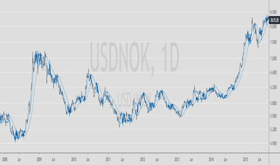 Also one of my favorite indicators. Very simple and easy to use. Essentially volatility bands with a technical analysis pattern, the triangle/wedge, which I have called "contraction signal". Put simply: When price is written in blue, volatility overall is falling. When the outer bands start to fatten up in blue, a contraction signal is forming. Works with any length of your choosing.
