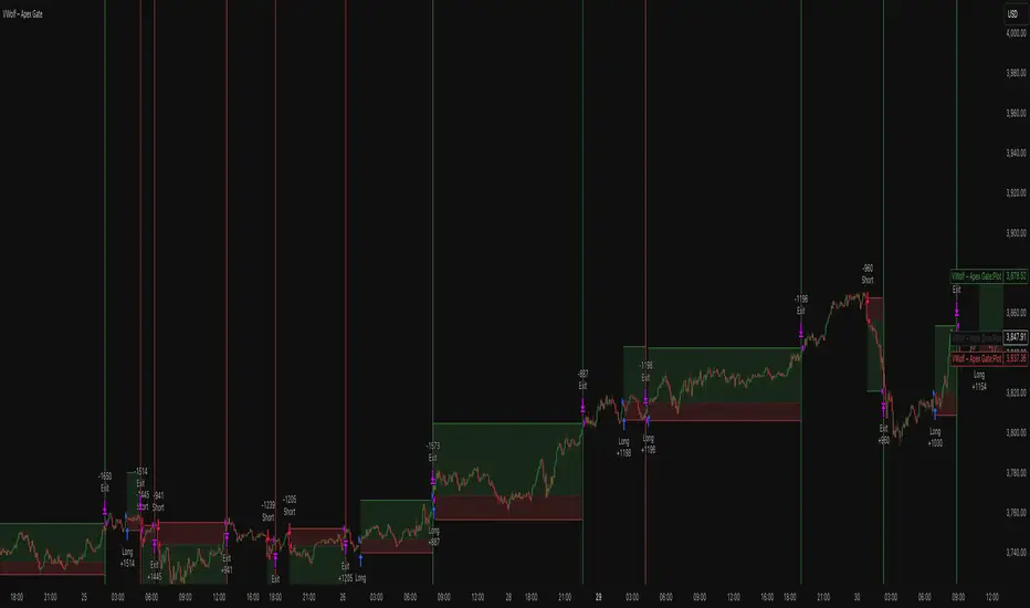 VWolf – Apex Gate seeks to enter shortly after **regime flips**, demanding alignment between a **pivot-aware Supertrend** and (optionally) a **classic Supertrend**, while an **EMA gate** enforces directional discipline. With **ATR-driven** stops/targets and **fixed-fraction** sizing, the system adapts naturally to changing volatility. Use the **Backtest** window to dial ranges and the **Forwardtest** window to prove durability on unseen data. For best results, tailor ATR multipliers and the EMA gate to your instrument’s structure and your personal drawdown tolerance.
