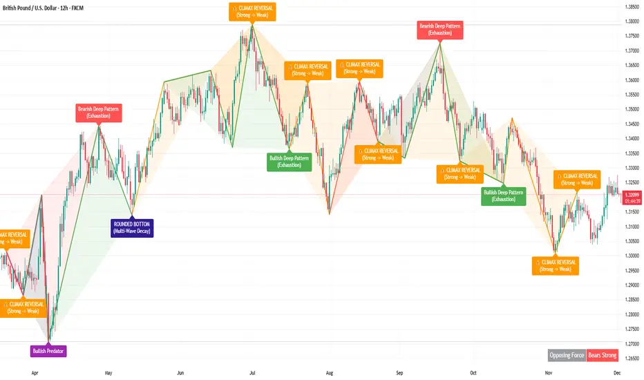 Output: Draws the pattern in Orange labeled "⚠️ CLIMAX REVERSAL". This is your "Trap" detector.