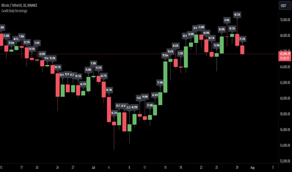 The Candle Body Percentage Indicator is a custom TradingView script designed to display the percentage of the candle's body relative to the full candle length for each bar on the chart. This indicator helps traders quickly assess the strength of price movements by comparing the body (the range between the open and close prices) to the total range of the candle (the range between the high and low prices).