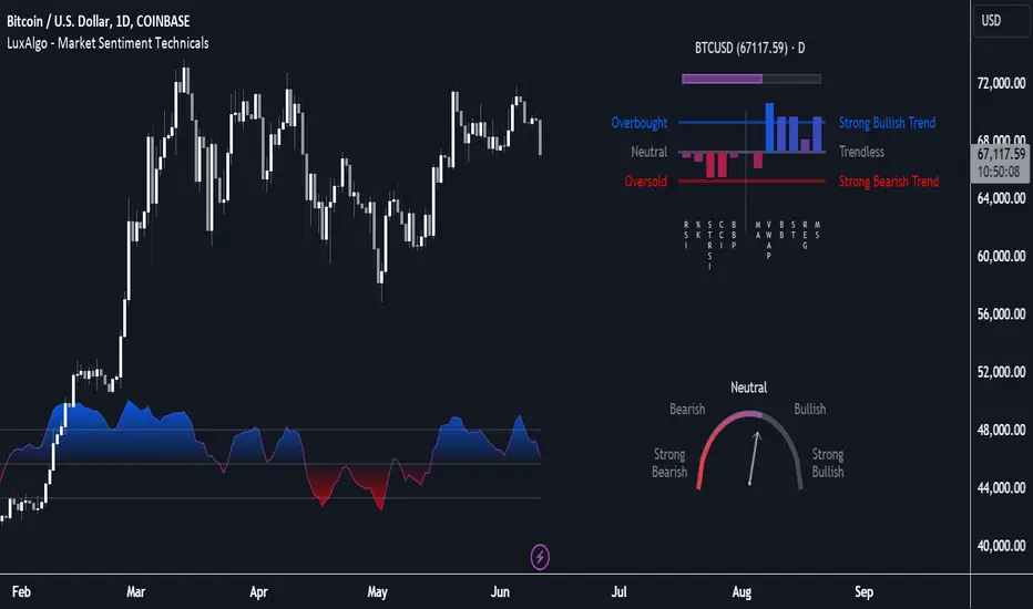 The Market Sentiment Technicals indicator synthesizes insights from diverse technical analysis techniques, including price action market structures, trend indicators, volatility indicators, momentum oscillators, and more.