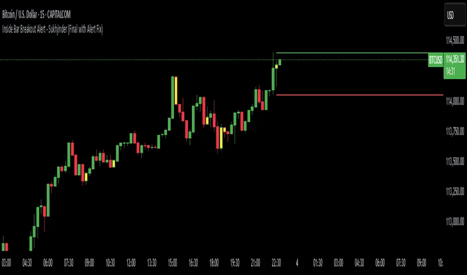 This indicator helps you reduce your screen time by giving you consistent alerts on the formation of inside bar candle and it gives you bullish and bearish alerts on breakout of the mother candle. So if you believe in inside strategy this indicator will be helpful for you.