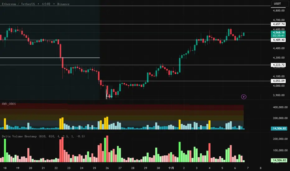 The Delta Volume Heatmap visualizes the real-time strength of per-bar delta volume — highlighting the imbalance between buying and selling pressure.