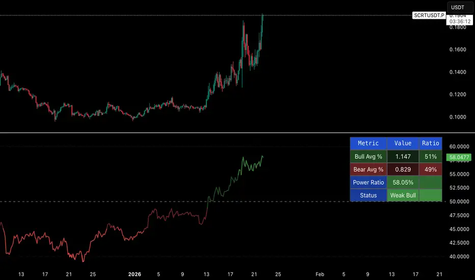 The Advanced Bull–Bear Power Indicator is a momentum and market strength tool that quantifies the balance of power between buyers (bulls) and sellers (bears) over a selected lookback period. Rather than focusing only on price direction, it measures how much effort each side applies to move the price, combining both candle magnitude and candle frequency into a normalized strength metric.