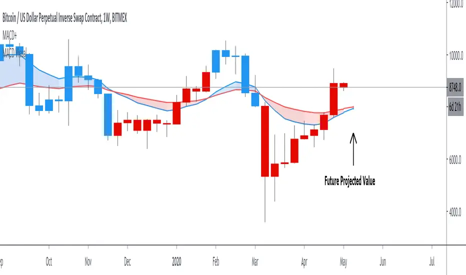 A quick way to visualize the status of the MACD: positive or negative, rising or falling. Also plots a projection of the next candle's EMA values for the MACD. This is only an estimate and will only be finalized upon candle close. You can also extend the lines to see where they may cross based on current trajectories.