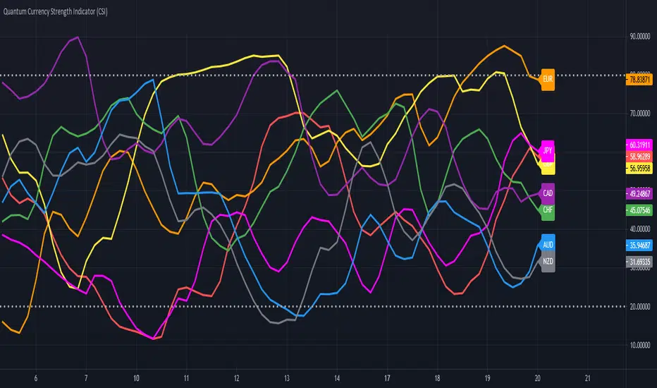 The Quantum Currency Strength indicator has been designed with one simple objective in mind. To give you a bird’s eye view of the eight major currencies. To show you in a simple, quick and easy way, when a currency is either oversold or overbought, rising or falling strongly, or just going nowhere.