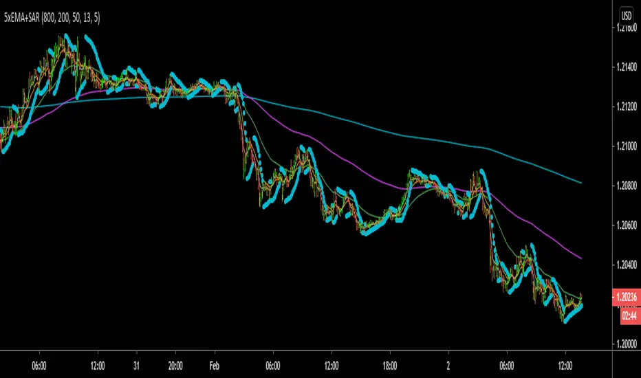 This script looks at 5 different EMAs so that you can compare the short term to the long term trend, and combines it with the Parabolic SAR. This can be used to find a great entry into a new or reversing trend.