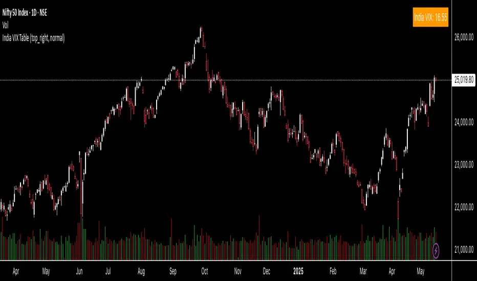 This indicator gives you the India Vix value in real time on your chart. You can change the position on the chart as per your preference.