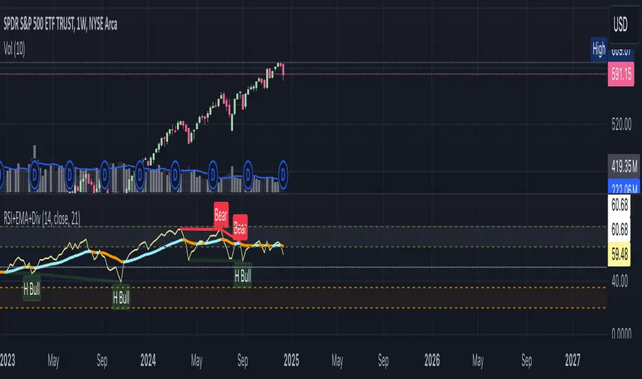 - Includes an Exponential Moving Average (EMA) of the RSI for trend smoothing and confirmation.