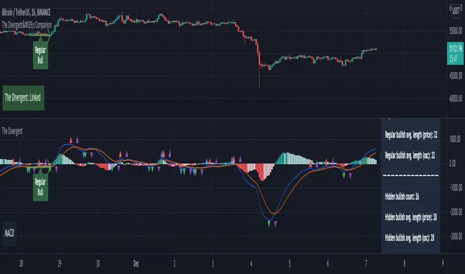 When you apply The Divergent's Companion indicator to your chart together with The Divergent, you will have the divergences drawn on both the prices and the oscillator.