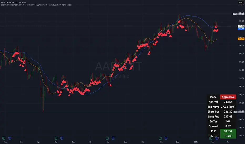 9. Dynamic Dashboard – Displays key metrics including Mode, Annual Volatility, Expected Move, Short/Long Put, Buffer, Spread, PoP, and Trade Status; uses color coding for easy interpretation.