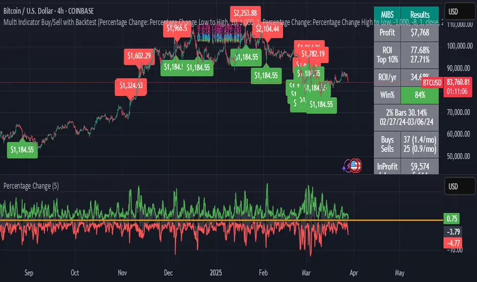 This backtest indicator allows you to configure up to 4 different indicators and set buy/sell levels for each one, then back test how well your strategy would have worked over a given time period.My original ROI calculation did not re-invest the profit correctly. I updated the script so the script now simulates placing each buy based on the configured percentage of the original dollar amount. Then when cash on hand surpasses the original dollar amount the amount used per buy gets re-calculated based on the new amount available.