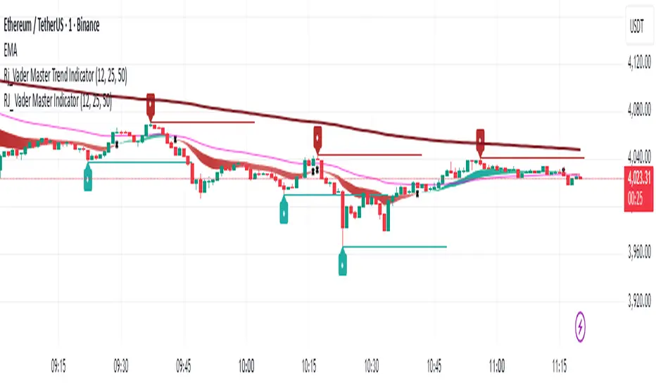 The Rj_Vader Master Indicator is a trend-following tool designed to identify key momentum shifts using a dual EMA system. It highlights crossover signals, potential reversal levels, and visually marks significant swing highs and lows. The script provides clear dynamic support/resistance levels along with color-coded trend zones for quick market direction analysis.