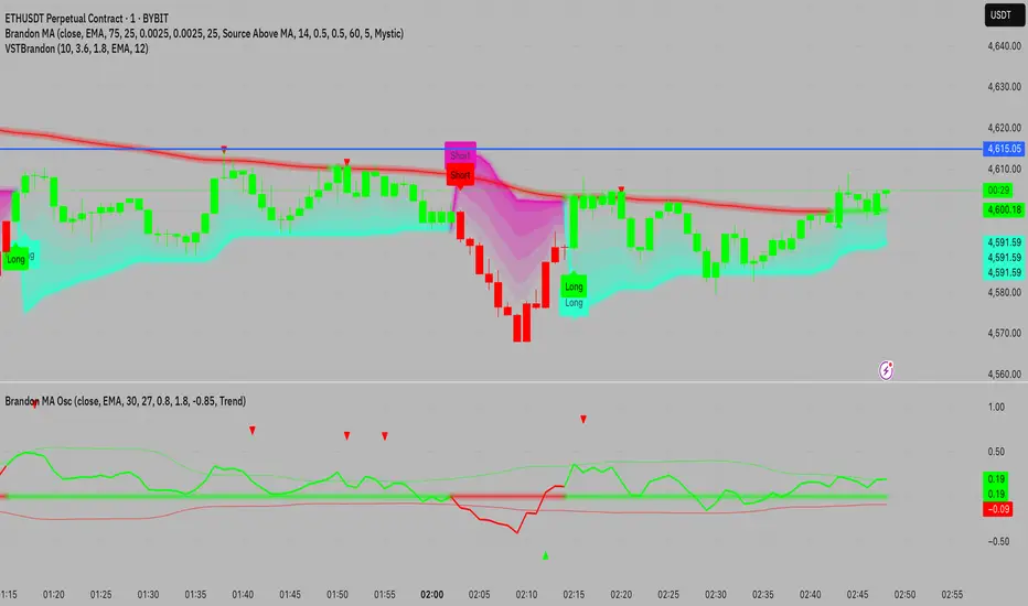 Builds a volume-adjusted MA baseline, then runs an ATR Supertrend with asymmetric multipliers to determine bullish/bearish state. The line, glow band, gradient area, candles, and Long/Short labels all follow the active trend, with alert hooks for automation.