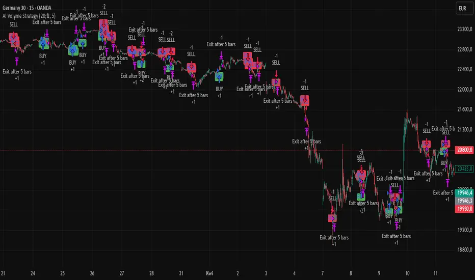 AI Volume Strategy detects significant volume spikes and combines them with trend direction and candlestick color to generate buy and sell signals. The strategy uses an Exponential Moving Average (EMA) of volume to identify abnormal volume spikes that may indicate strong market activity. Additionally, it uses a 50-period EMA of price to filter the trend and decide on entry direction.