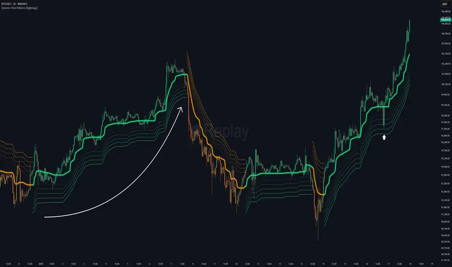 Dynamic Flow Ribbons [BigBeluga] offers a sleek and insightful view into trend strength and structure. By visualizing volatility expansion with directional flow, it becomes a powerful overlay for momentum traders, swing strategists, and trend followers who want to stay ahead of evolving market flows