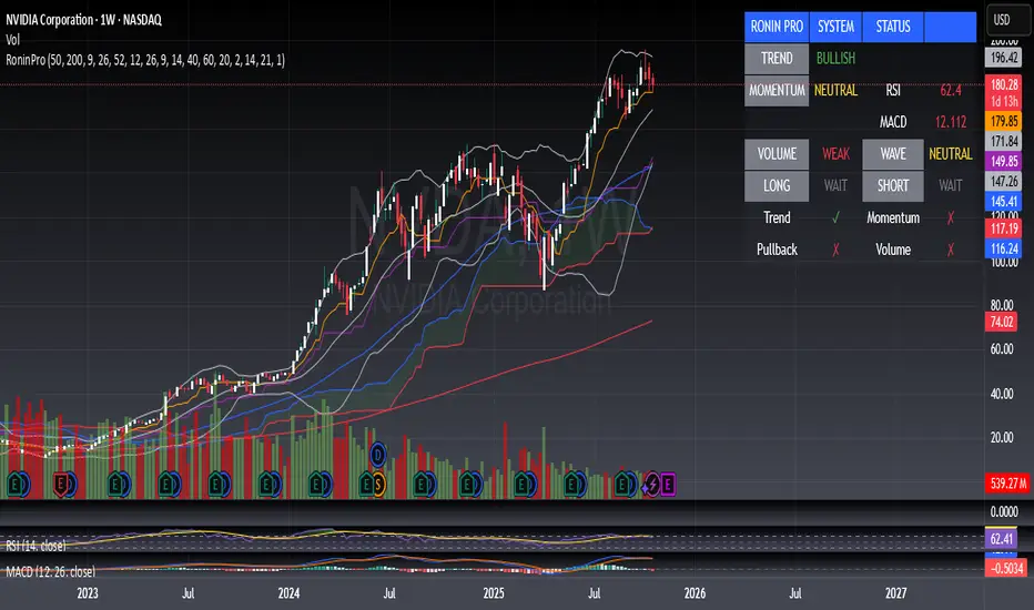 Ronin Pro Trading System is a comprehensive multi-timeframe trading indicator that combines trend analysis, momentum confirmation, volume validation, and Elliott Wave structure to provide high-probability entry and exit signals. Designed for serious traders who want a systematic approach to market analysis.