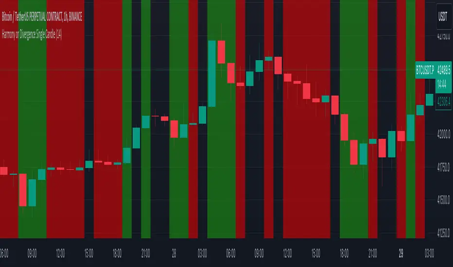 - Based on the user's input, it colors the background of the chart to reflect identified patterns. Each state (harmony above or below average, divergence with higher volume or larger candle body) can be highlighted with different colors, providing immediate visual cues to the trader.