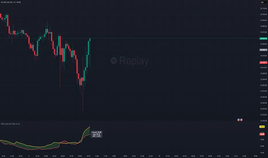 Gives you last 20 candles ATR (Red Line) , and averages the last 2 weeks' ATR at your current time (Yellow Line)