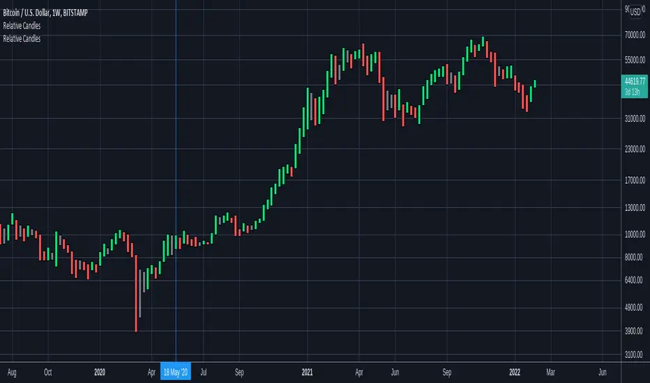 Custom candles which only didsplay highs and lows. Color depends on relative position of highs and lows and indicates whether it is going up, down or indecision based on this relative position. Made specially for superchiqui :P