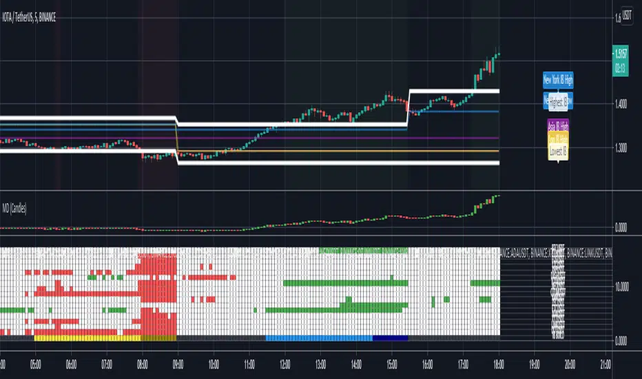 Though Initial Balance is based off the first 60 minutes of the trading markets opening, but Crypto is 24/7, this indicator looks at how Asia, London and New York Stock Exchanges opening trading can affect Crypto price action.