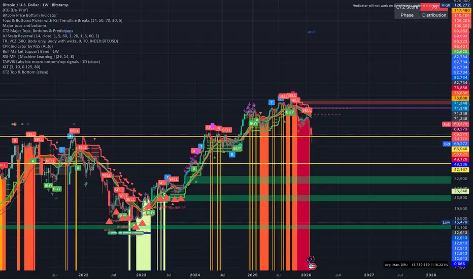 The **CTZ Top & Bottom Finder** is a **macro Bitcoin market cycle indicator** designed to help traders identify key accumulation and distribution phases. It uses a combination of: