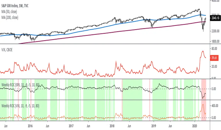 The background will turn GREEN when ROC(SPX) is above -5 and ROC(VIX) is below +10.