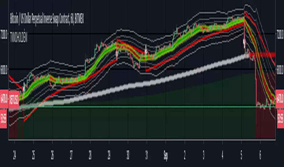 on settings you have the option to activate the SwingZone, which will load and area signaling the Swing Zones on red or green for longs and shorts, which you should look for entry points and a white/red moving average, which crossings with the price line might be taken as an early exit signal (not perfect, but its best i could come up after a lot of trial and error), or you could use the stopcrossing line from the previous indicator :)