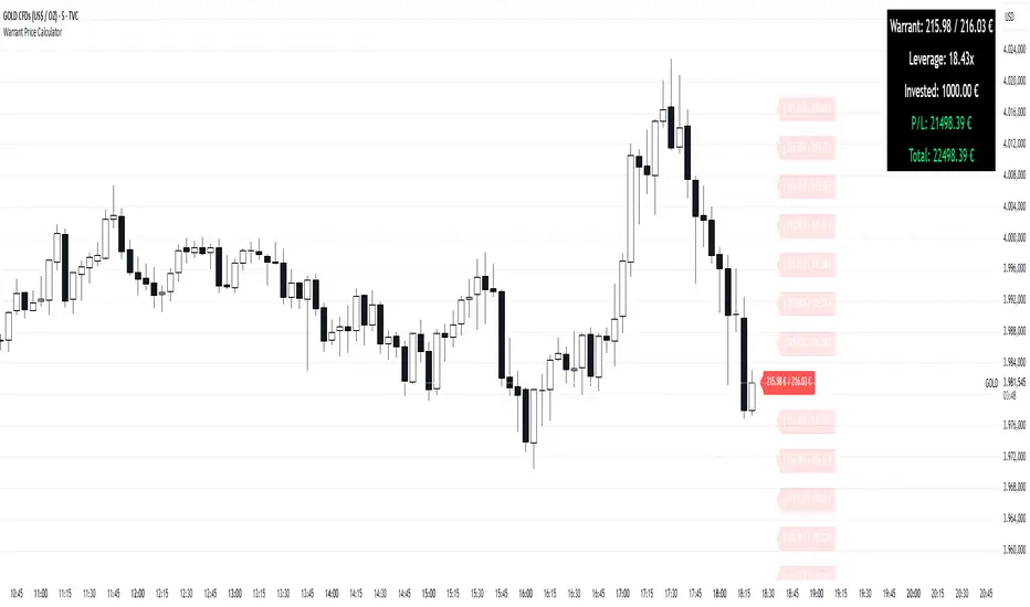 The Knock-Out Warrant Calculator enables live calculation and visualization of knock-out products, turbos, and mini futures (german market specific) directly on the chart – including leverage, profit, loss, and total position value.