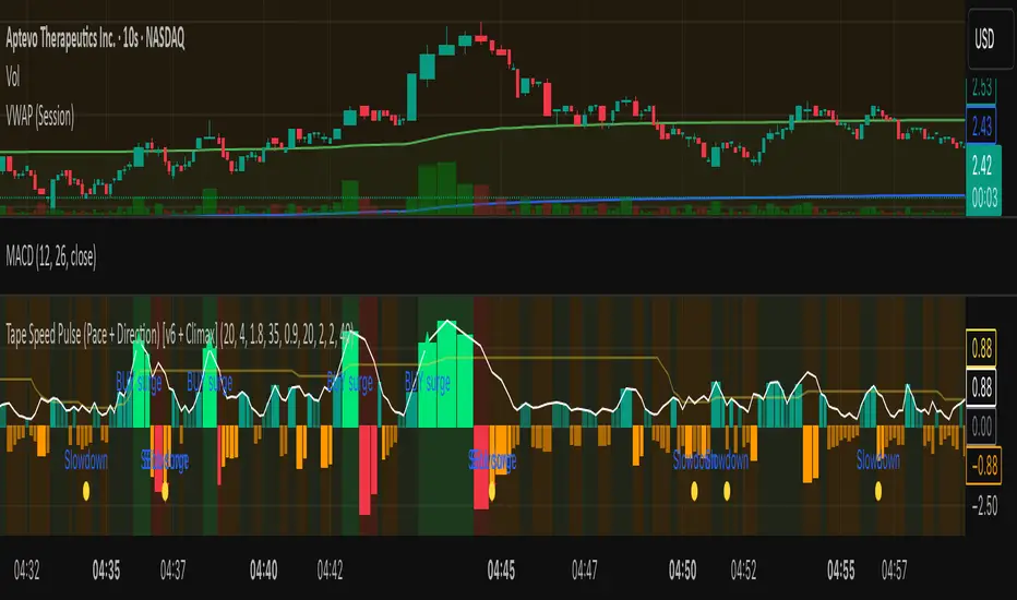 A lightweight “tape pulse” that turns intraday bursts of buying/selling into an easy-to-read histogram, with surge, slowdown, and climax (exhaustion) markers for fast decision-making. Use on sec and min charts.