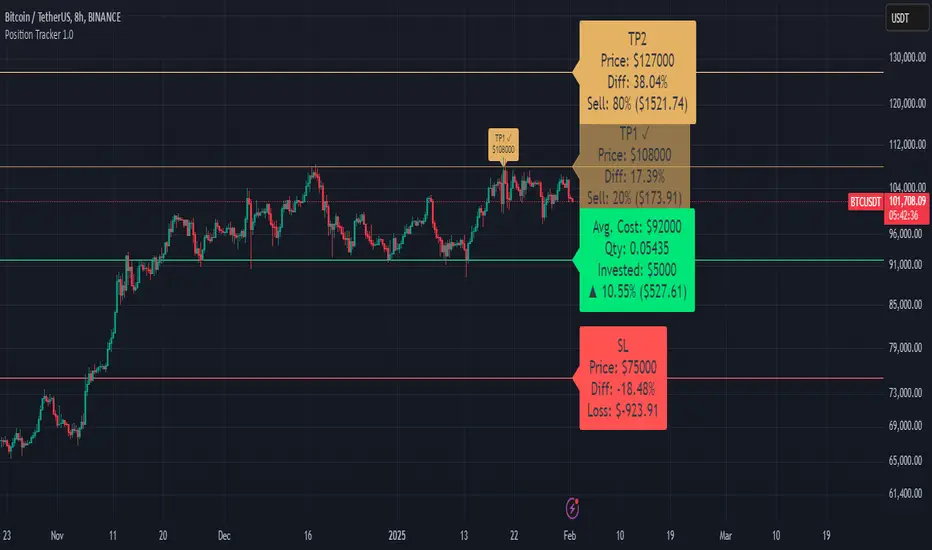 Position Tracker 1.0 allows users to input their position using USD, quantity, or a DCA approach while setting take profit (TP) and stop loss (SL) levels based on either fixed dollar values or percentages. The indicator provides optional markers for TP/SL crossings and an entry label showing key trade details. A live tracker can be enabled for real-time P&L updates, and all visual elements are customizable for clarity and preference.