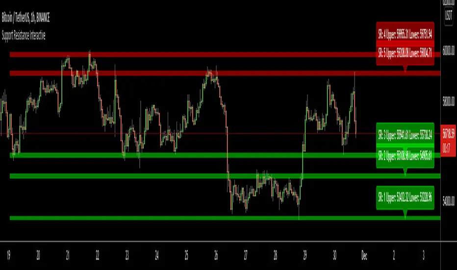 Using this "Support Resistance Interactive" script you can set the Support/Resistance levels interactively by clicking on the chart. Using the SR levels you set, the indicator creates Support Resistance zones. The width of the zones are calculated by using Threshold option and Threshold is the percent of the distance between Highest/Lowest levels in last 300 bars. if you set Threshold = 1 then it means 1% of the distance between Highest/Lowest levels. You can change SR levels by moving the level up/down by using your mouse anytime you want.