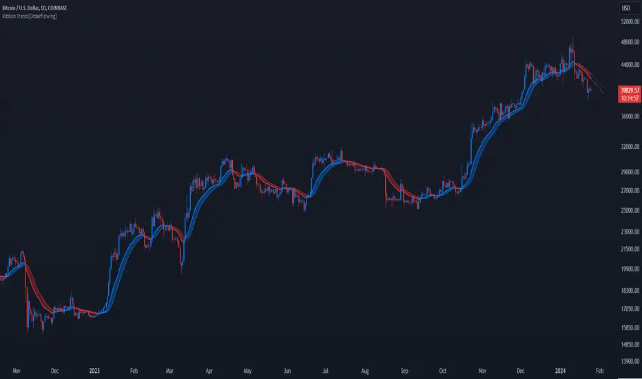 A bullish trend is indicated by a blue ribbon, while a bearish trend is represented by red.