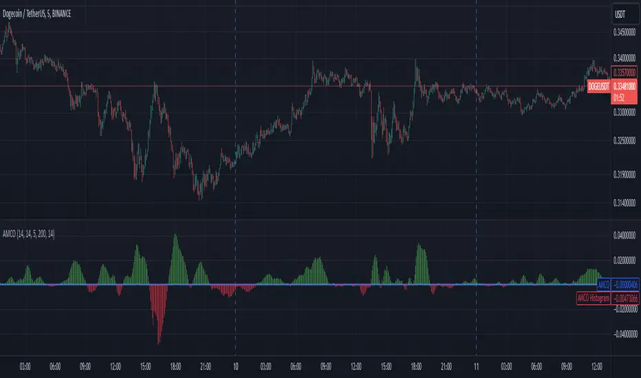 A standout feature of AMCO is its ability to adapt its sensitivity based on market volatility. Using the ATR (Average True Range) as a measure of current volatility, AMCO adjusts its calculation periods dynamically. During periods of high volatility, it extends its lookback periods to smooth out noise and avoid false signals. Conversely, in low-volatility environments, it shortens its periods to remain responsive to smaller price fluctuations. This adaptability ensures that AMCO remains effective and reliable in both trending and ranging markets.