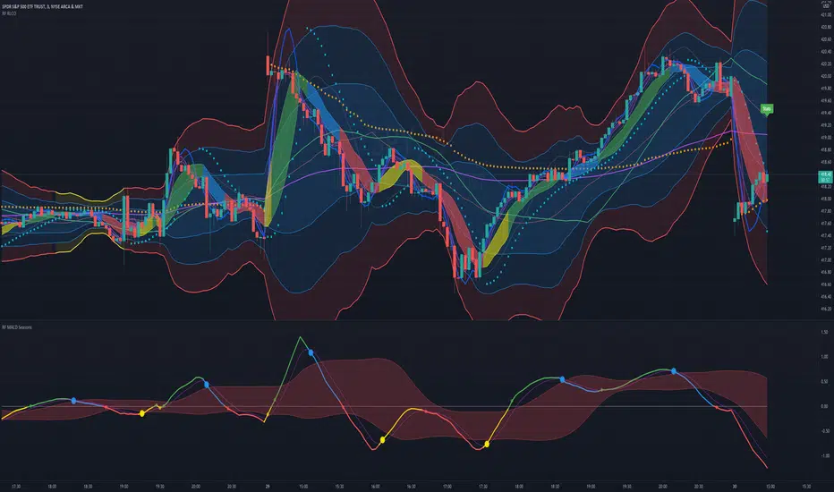 Also available (although it is a separate indicator it is included along with the framework) is the MACD Seasons Indicator which is loaded into its own sub-graph. All settings are preconfigured to be the same as Dr. Long uses out of the box and the plots include the MACD line colored by Season, the Signal line and the Red River. SSC (Spring Supported Crossing) Signals are specifically highlighted with large Dots on the MACD Line. Everything is customizable including not only coloring and line styles but also the underlying settings for lookbacks as well as a selector to use SMA's or EMA's for the calculations.